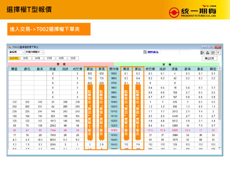 ※ 選擇權T型報價清晰明瞭,點選價位帶出下單匣!